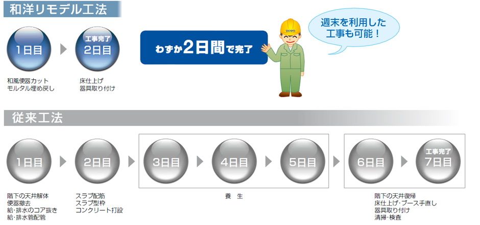 1フロア施工(階下での作業が不要)・2日間の短工期で既存の和風便器から洋風便器に改修する、TOTOのオリジナル工法です。